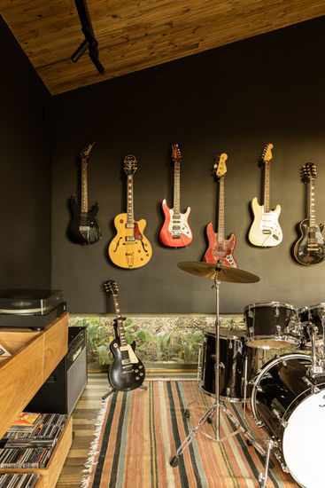 Um estúdio pensado para se escutar e fazer música, que abriga discos e instrumentos, pronto e equipado para receber amigos.