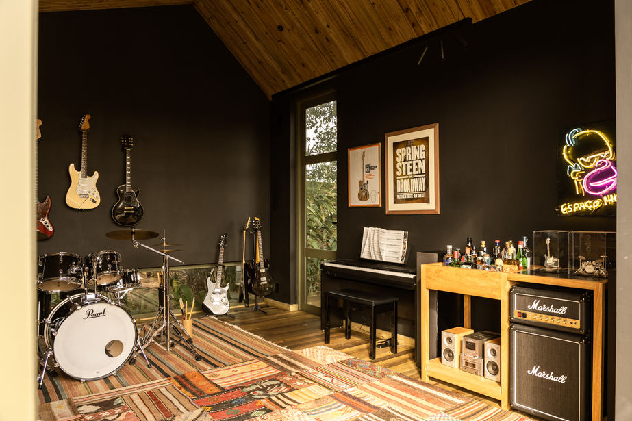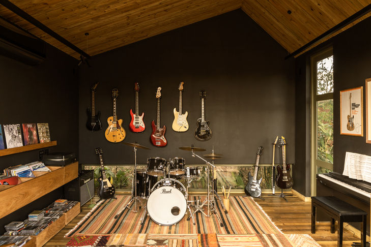 Ao fundo do jardim da casa, um novo anexo projetado especialmente para um dos hobbies que a família tem em comum: música.